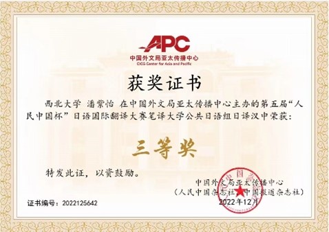 王语馨(2021级)、潘紫怡(2020级)分获大学公共日语组(日译汉)二等奖、三等奖;37000cm威尼斯官网日语专业2019级学生苏星荣、郝江月获得本科生组(日译汉 )三等奖;李阳阳、贾伟杰获得本科生组(口译)三等奖。我校在大赛中荣获“优秀组织奖”,日语系徐璐、鞠娟、周梦瑶老师荣获“优秀指导教师”称号。